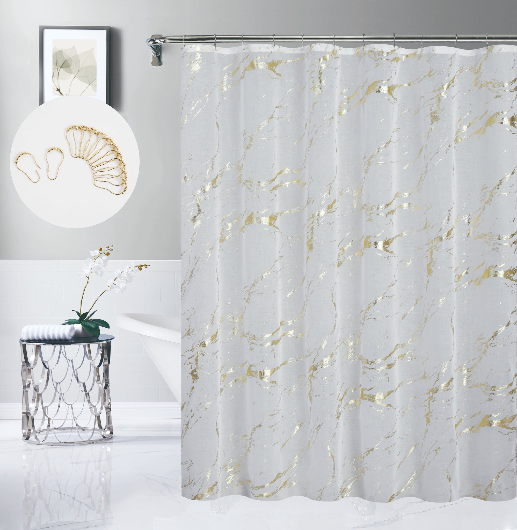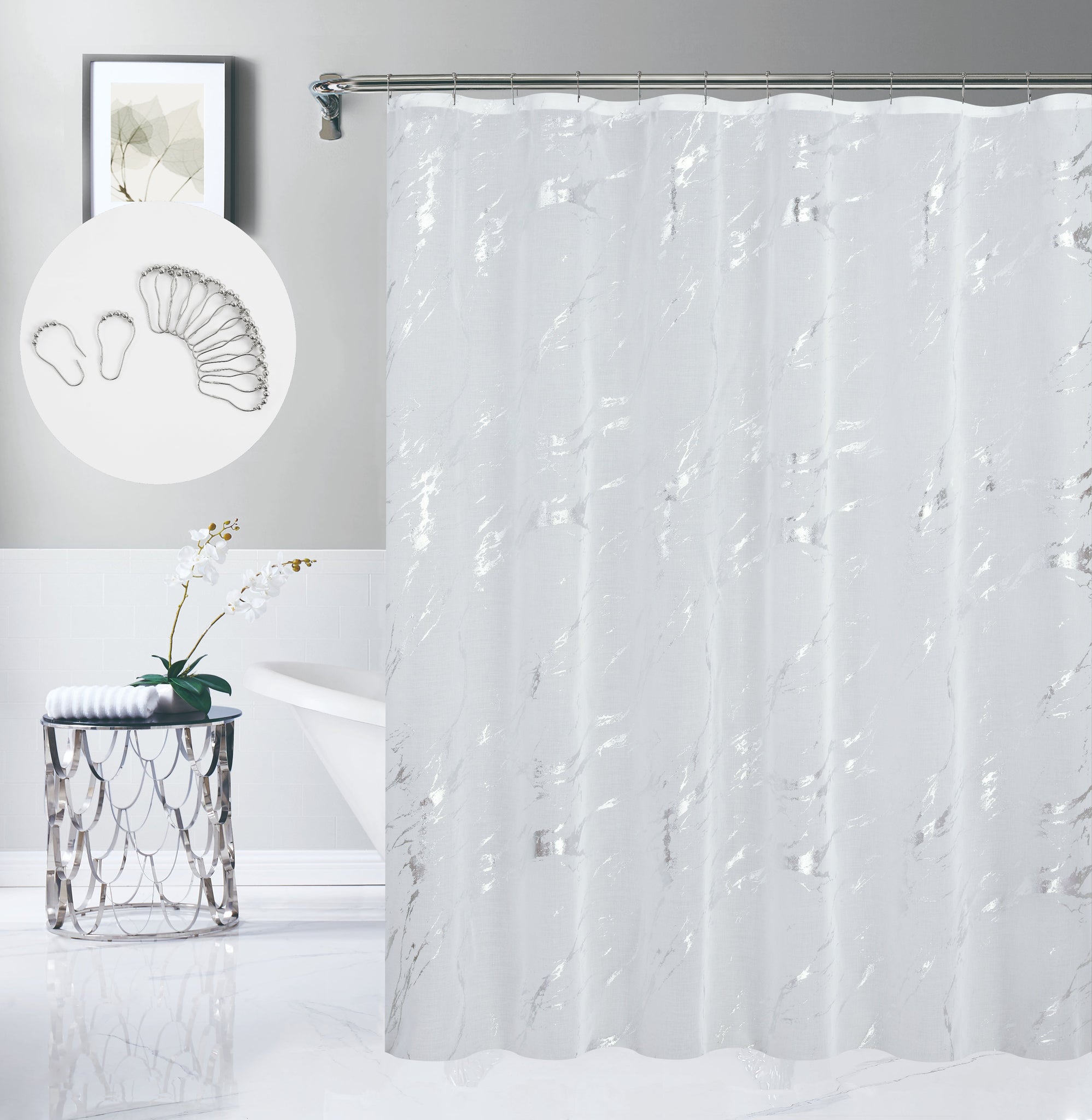 The Chloe 13-Piece Shower Curtain Set combines modern style with everyday functionality, featuring a beautifully woven slub-textured polyester fabric that mimics the look of linen while offering durability, quick-drying performance, and an elegant drape. Its shimmering metallic abstract print adds a touch of contemporary sophistication, brightening your bathroom décor with subtle shine and refined texture. Designed to enhance any bathroom—whether in a home, apartment, dorm, or RV—the Chloe shower curtain provides full coverage for tubs or shower stalls and includes a reinforced top header with sturdy finished holes for secure hanging. This complete set comes with 12 matching rollerball hooks that glide smoothly for effortless installation and a polished, coordinated look. Crafted from high-quality woven polyester, the curtain is easy to care for and can be machine washed in cool water and air dried or tumble dried on low as needed. Pair with a waterproof liner (sold separately) for best results and enjoy a beautiful, long-lasting, hotel-inspired upgrade to your bathroom space.
