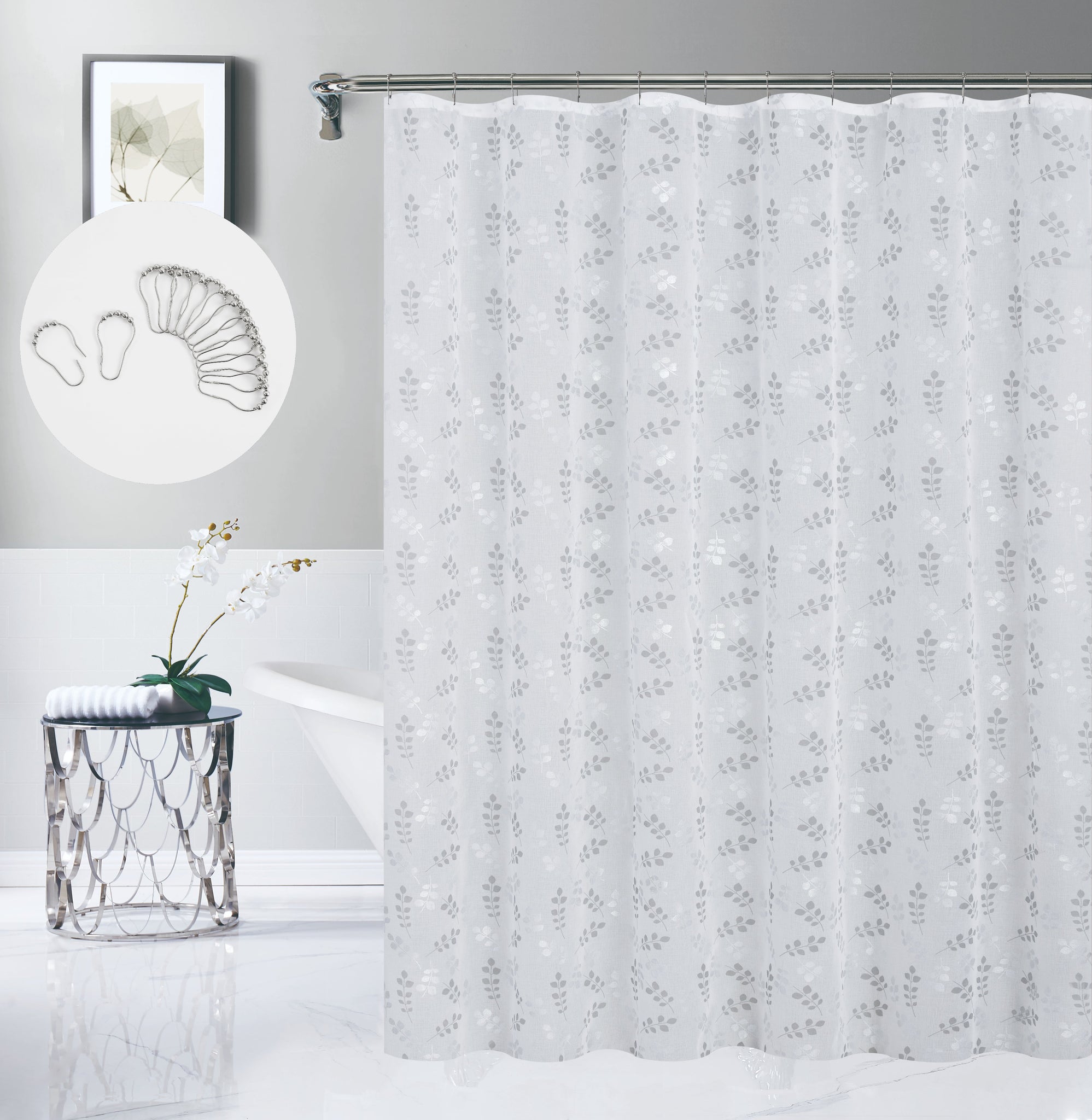 The Clarissa 13-Piece Shower Curtain Set combines modern style with everyday functionality, featuring a beautifully woven slub-textured polyester fabric that mimics the look of linen while offering durability, quick-drying performance, and an elegant drape. Its shimmering metallic floral print adds a touch of contemporary sophistication, brightening your bathroom décor with subtle shine and refined texture. Designed to enhance any bathroom—whether in a home, apartment, dorm, or RV—the Clarissa shower curtain provides full coverage for tubs or shower stalls and includes a reinforced top header with sturdy finished holes for secure hanging. This complete set comes with 12 matching rollerball hooks that glide smoothly for effortless installation and a polished, coordinated look. Crafted from high-quality woven polyester, the curtain is easy to care for and can be machine washed in cool water and air dried or tumble dried on low as needed. Pair with a waterproof liner (sold separately) for best results and enjoy a beautiful, long-lasting, hotel-inspired upgrade to your bathroom space.